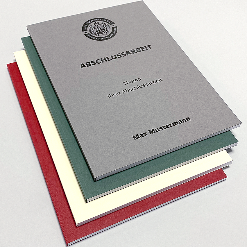 Gedruckt werden Ihre Abschlussarbeiten auf einem reinweißem, leicht gestrichenem Qualitätspapier in den Grammaturen 100g/m2 und 120g/m2. Durch dieses Papier bekommen Ihre Arbeiten ein eindrucksvolles Ergebnis, mit originalgetreuen Farben und gestochen scharf gedruckten Abbildungen und Texten. Bei der Papierstärke 100g/m2 bieten wir auch eine matte Oberfläche an, dieses Papier ist für Arbeiten OHNE Bilder, Fotos oder Grafiken geeignet.