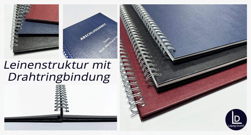 Das Hardcover hat eine Leinenstruktur und somit ein sehr hochwertiges Erscheinungsbild. Die Oberfläche des Hardcovers ist matt lackiert, hässliche Fingerabdrücke werden so vermieden. Dieses Leinen ist äußerst strapazierfähig und langlebig. Bei dieser Art der Hardcover-Bindung werden Ihre Abschlussarbeiten in zwei Hardcover-Deckel mit einer Drahtringbindung eingebunden. Hier ist nur eine einfache Textzeilenbeschriftung möglich, diese ist ein- bis sechszeilig. Nähere Informationen finden Sie unter dem Punkt "Information zum Druck".