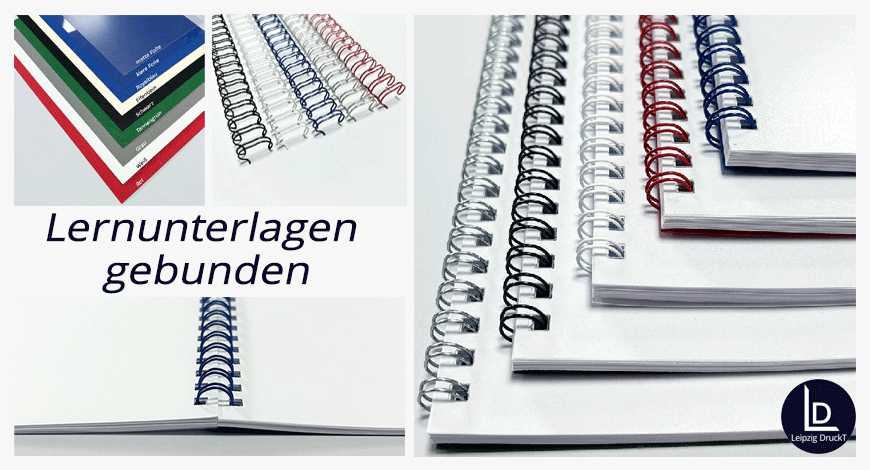 Unter dieser Kategorie können Sie Ihre Lernunterlagen gedruckt und gebunden in einer einfachen und preiswerten Softcover-Drahtringbindung bestellen. Sie besteht aus einem Drahtringbindekamm, einer Frontfolie und einem 270g Karton hinten. Diese Art der Bindung ist bestens für Ihre Lernunterlagen geeignet, da diese beim darin arbeiten offen liegen bleibt. Es gibt verschiedene Farben der Bindekämme, verschiedene Oberflächen der Frontfolie und verschiedene Farben des Rückenkartons.