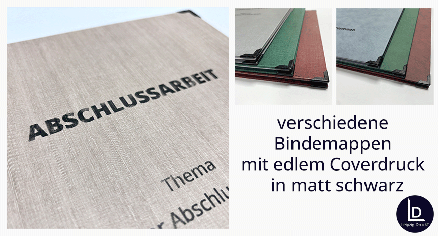 Bei allen Bindemappen erfolgt der Coverdruck in einem matt schwarz, dieser verleiht Ihren Arbeiten eine sehr exklusive, hochwertige und edle Note. Bei der Bindemappe mit Leinenstruktur ist nur eine einfache Textzeilenbeschriftung möglich, diese ist ein- bis sechszeilig. Ein Coverdruck mit einer Extradatei ist nur bei den Bindemappen im Kunstleder und Kaschmir Leinen möglich. Die Informationen zum Erstellen der Datei finden Sie unter dem Punkt "Information zum Druck".