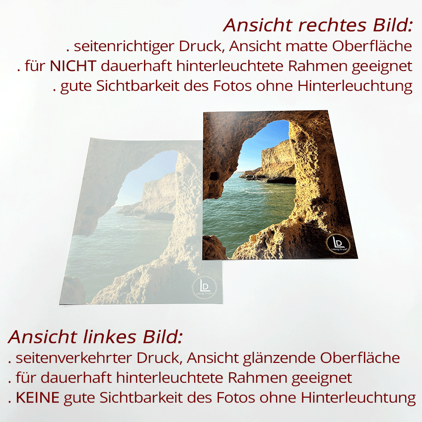 Wir drucken Ihre Fotos auf einen hochwertigen, satinierten 220 μm Backlit-Film. Diese transluzente Folie ist für den Druck von Fotomotiven für Leuchtkästen, LED-Bilderrahmen oder ähnlichem genau das Richtige. Sie ist resistent gegen Kondenswasser und Luftfeuchtigkeit. Somit kann Ihr Produkt problemlos in Innen- und Außenbereich eingesetzt werden.